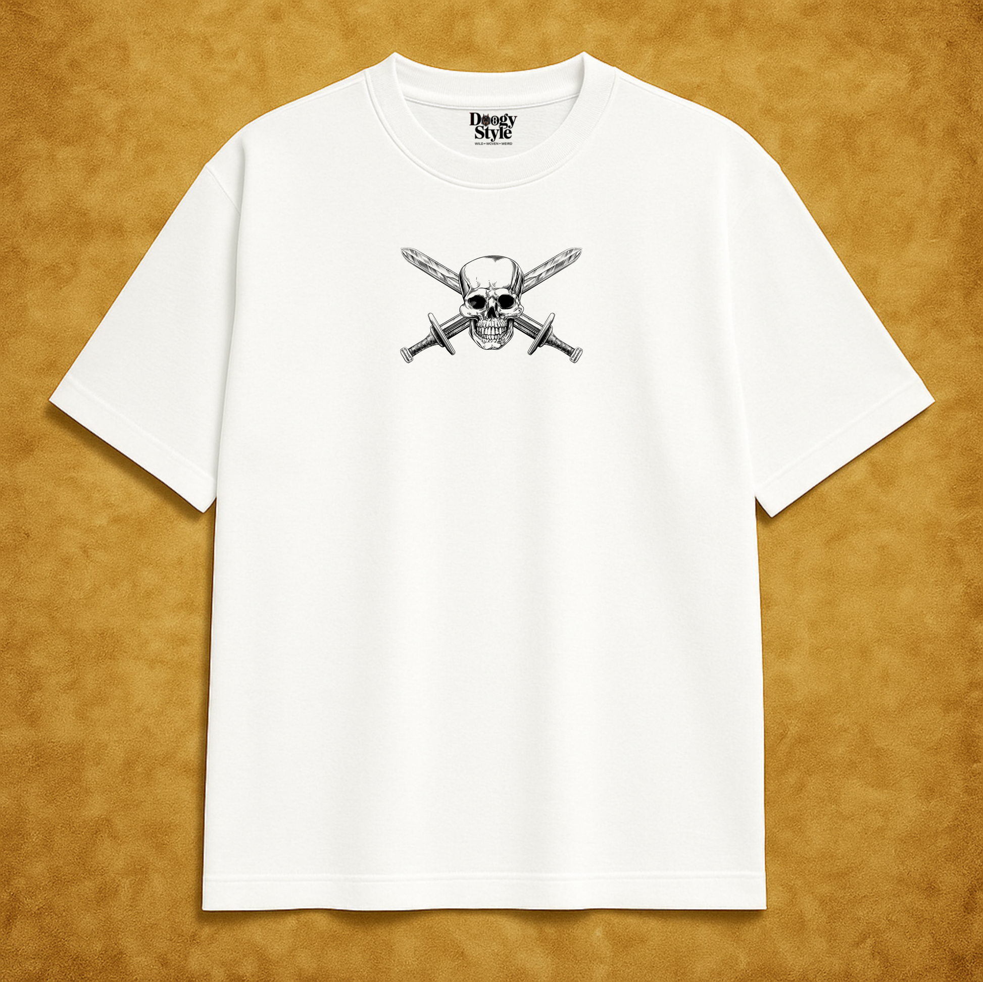 Step into fearless streetwear with the Doogystyle Skull & Swords Tee. Crafted from premium cotton for all-day comfort, this clean white oversized fit features a striking center-chest graphic — a detailed skull with crossed swords — symbolizing boldness, rebellion, and strength. Perfect for those who wear their attitude loud and proud.