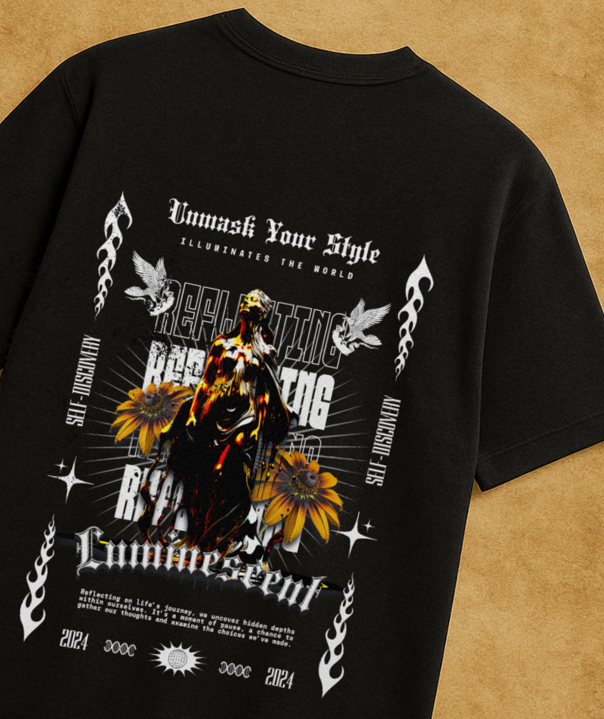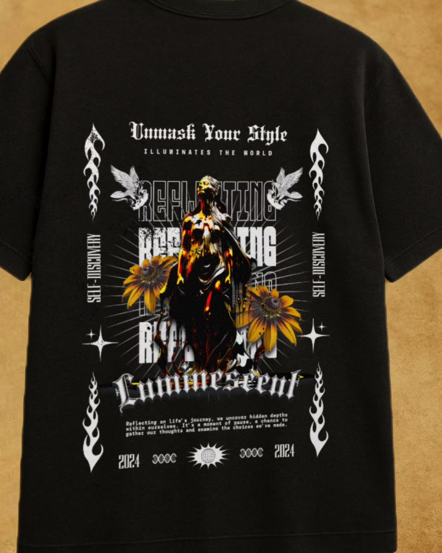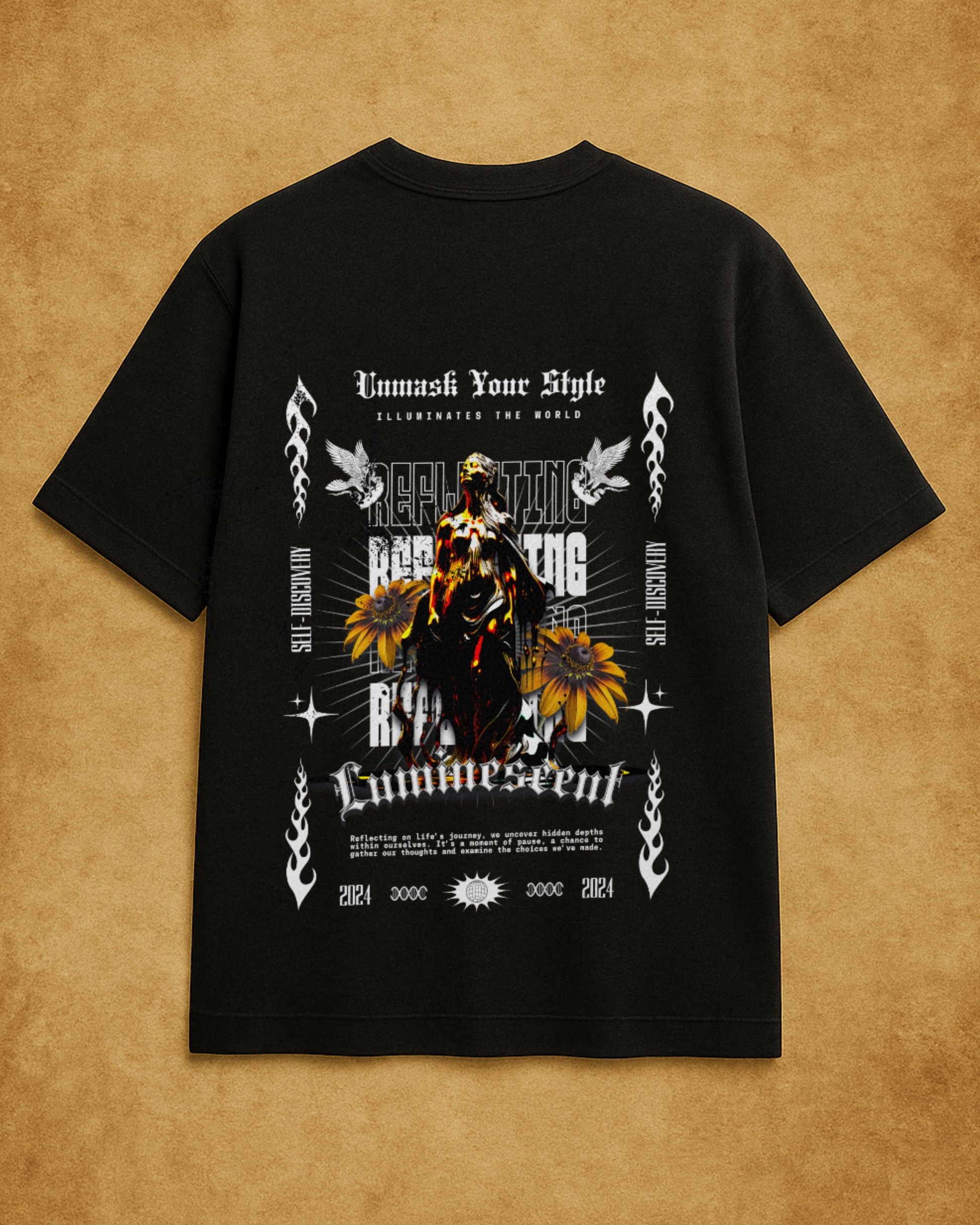 This oversized tee features a molten figure surrounded by blooming sunflowers, layered with gothic typography and spiritual fire motifs.