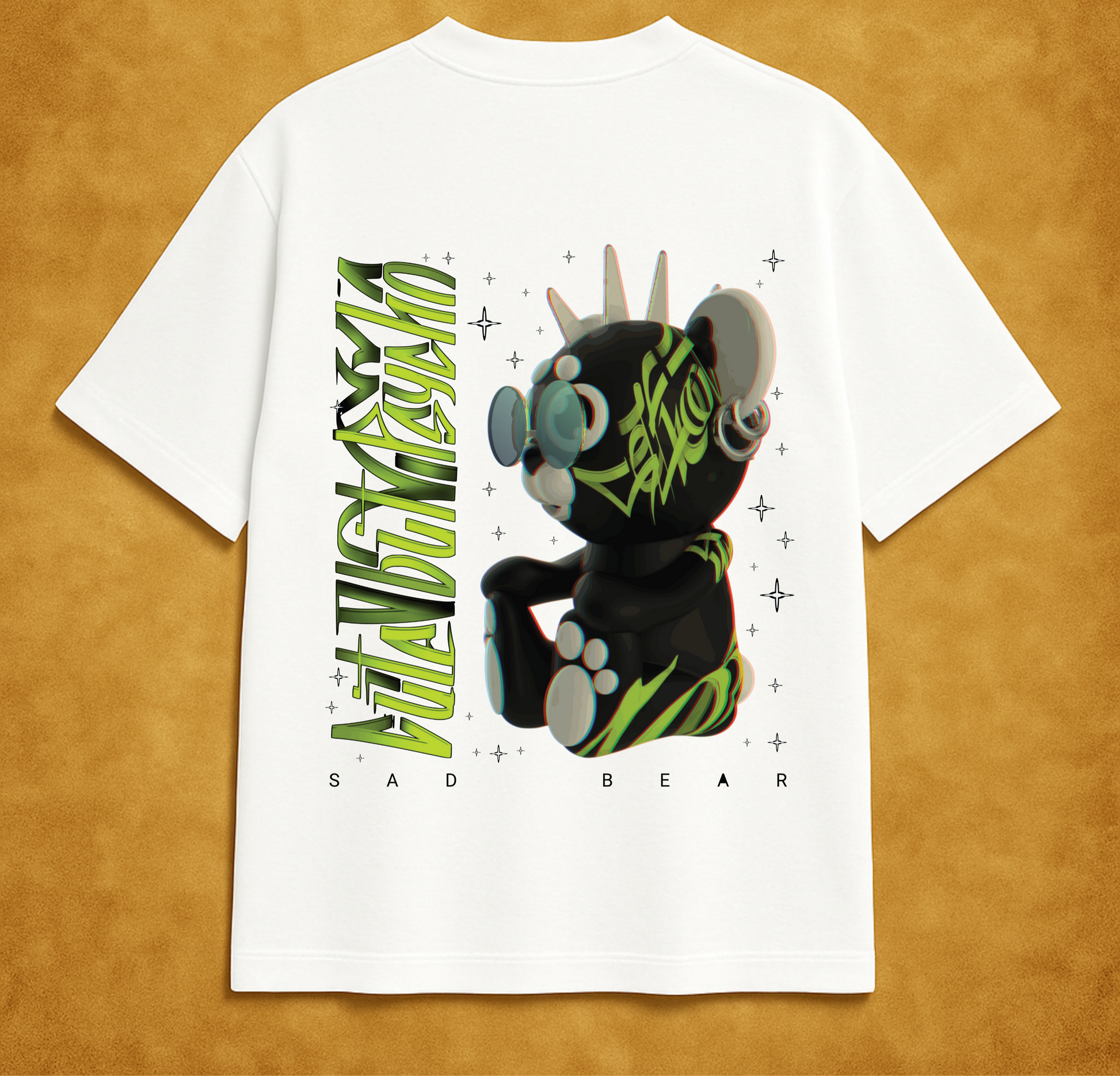 This tee blends streetwear edge with playful character design. Featuring a bold 3D “Sad Bear” graphic in black and neon green, complete with graffiti-style lettering and a crown, it stands out as an urban statement piece. Printed on premium white fabric, the oversized back artwork adds depth and attitude, perfect for fashion lovers who want comfort without sacrificing style.