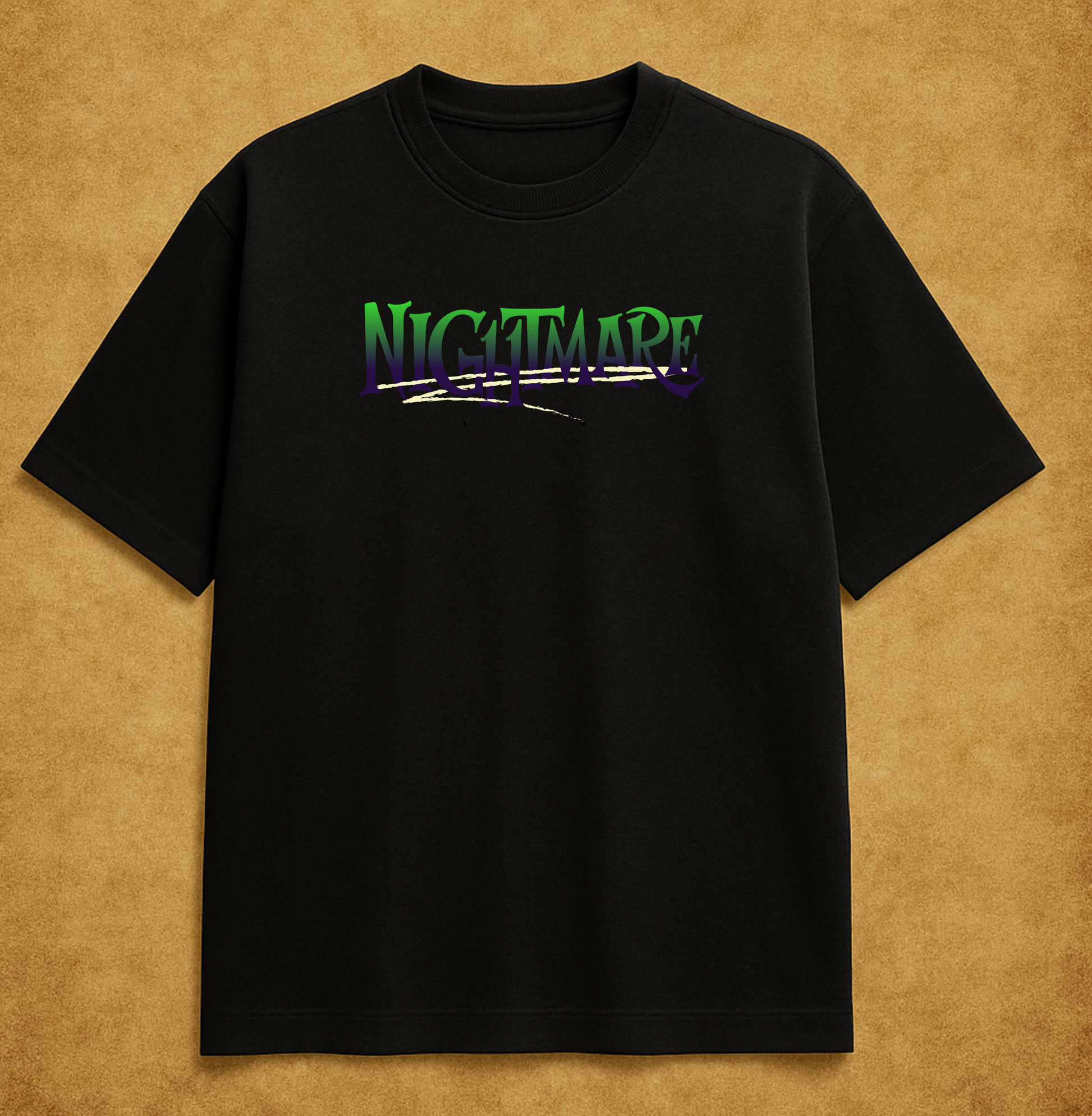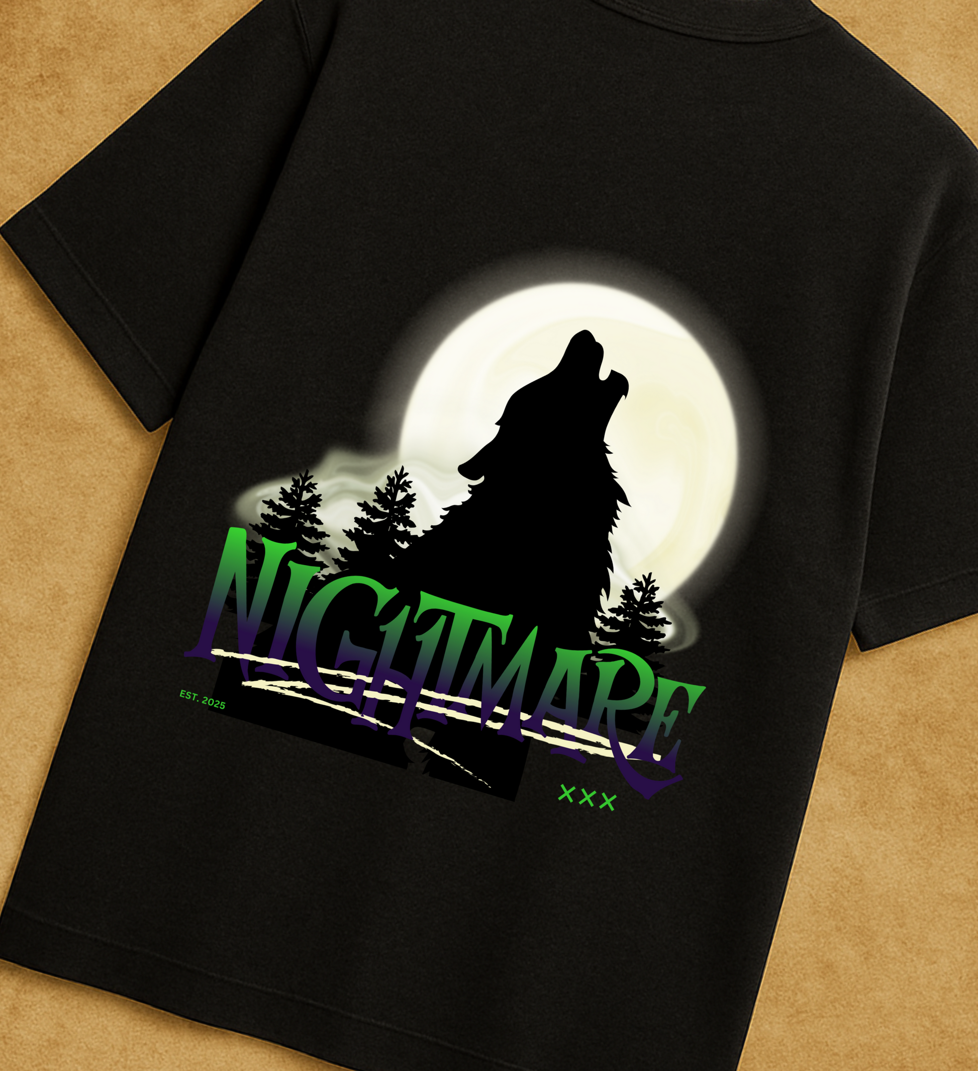 Unleash the wild. This oversized heavyweight tee features a bold back print of a howling wolf silhouetted by a full moon, wrapped in misty pines and the word NIGHTMARE in electric green and purple gradients. A haunting streetwear statement built for those who don’t blend in.